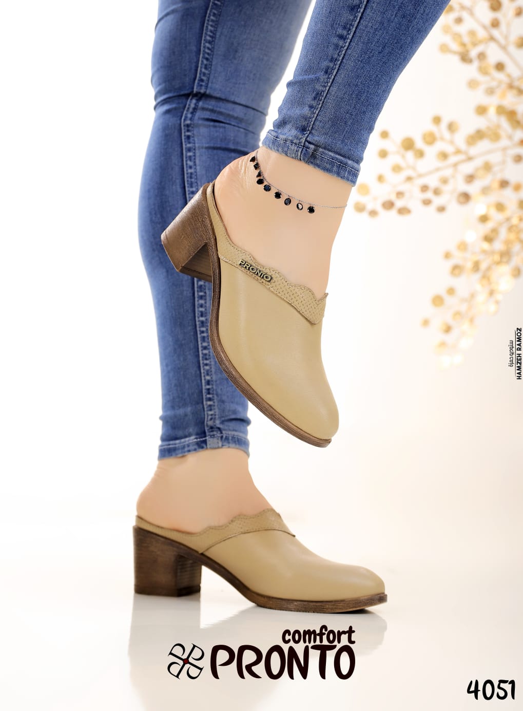 حذاء نسائي مفتوح من الخلف بلون بيج أنيق، مصنوع من جلد ناعم مع كعب متوسط ثابت يمنح راحة وثبات، تصميم عملي بلمسة أنثوية مناسب للاستخدام اليومي والمشاوير