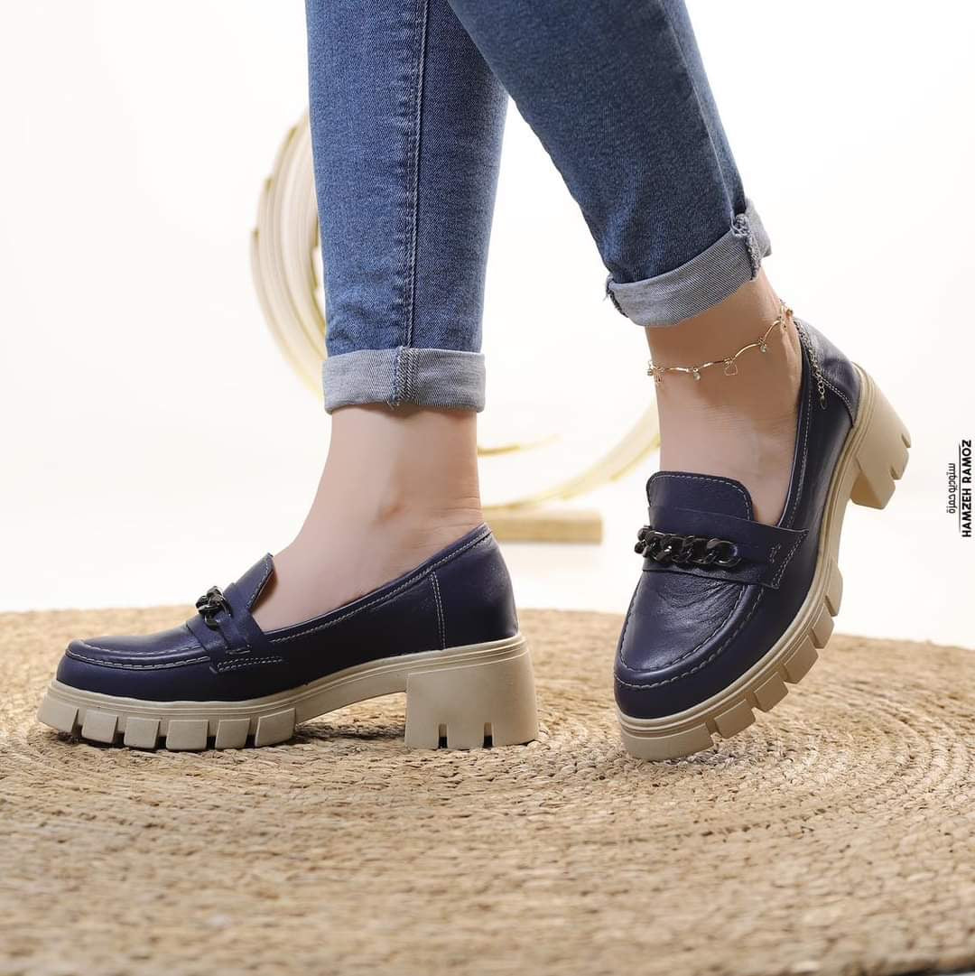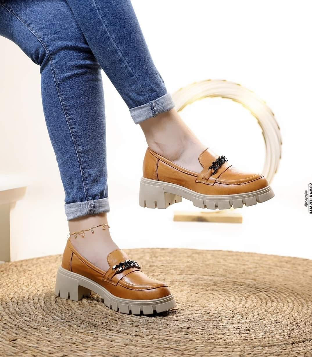 حذاء نسائي باللون الجملي، بتصميم عصري مع سلسلة معدنية أمامية تضيف لمسة جريئة، مناسب للاستخدام اليومي وإطلالات الكاجوال العصرية