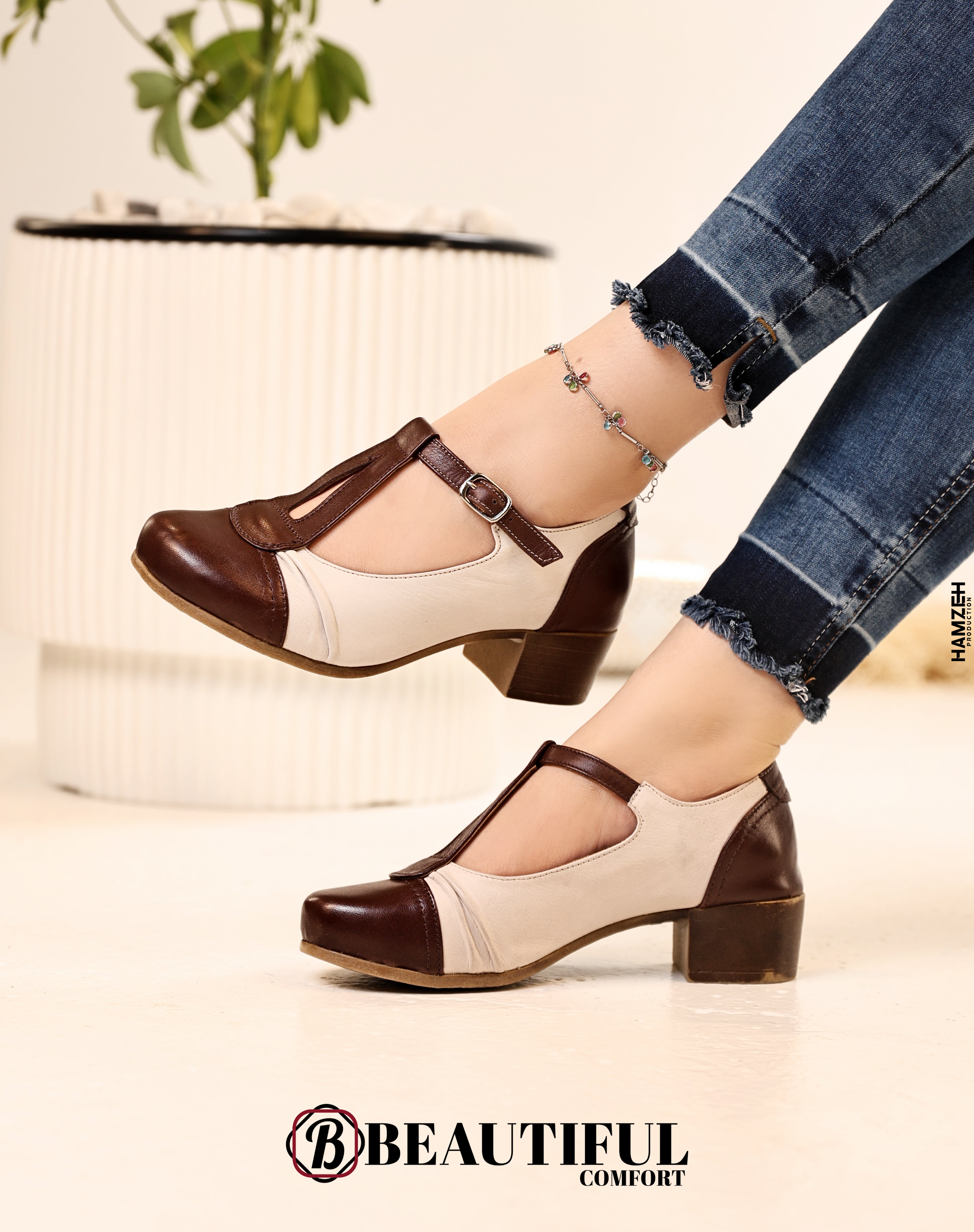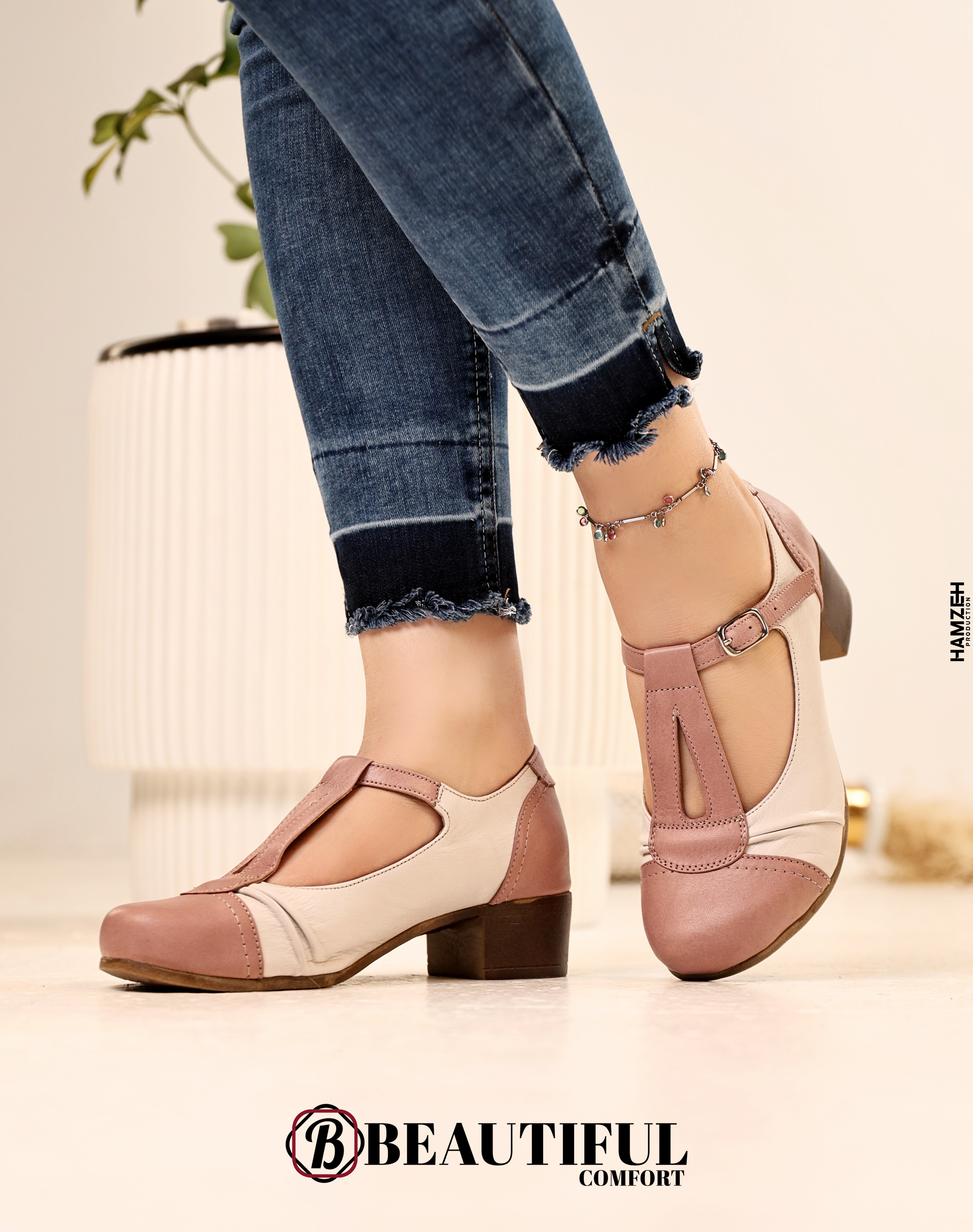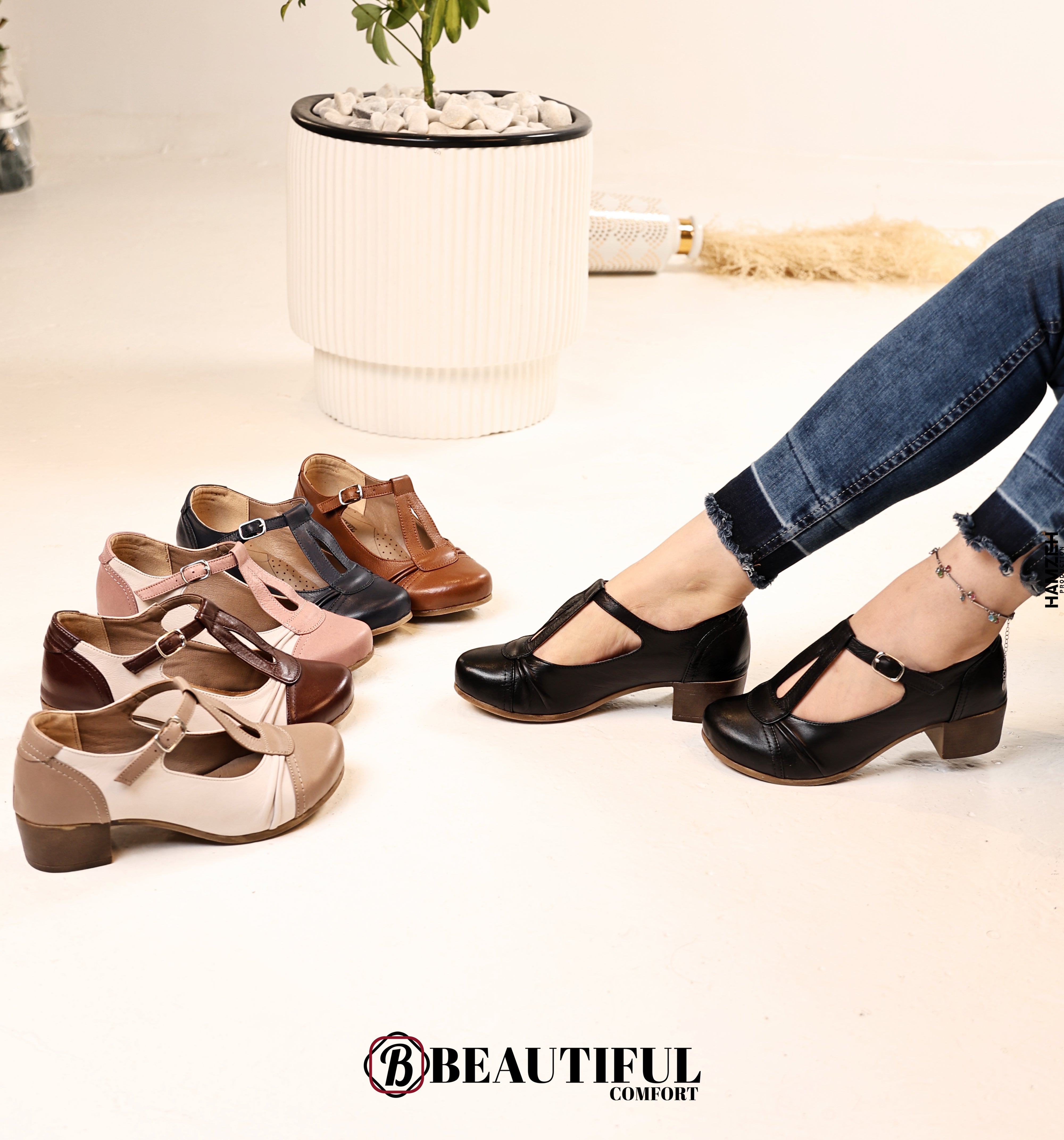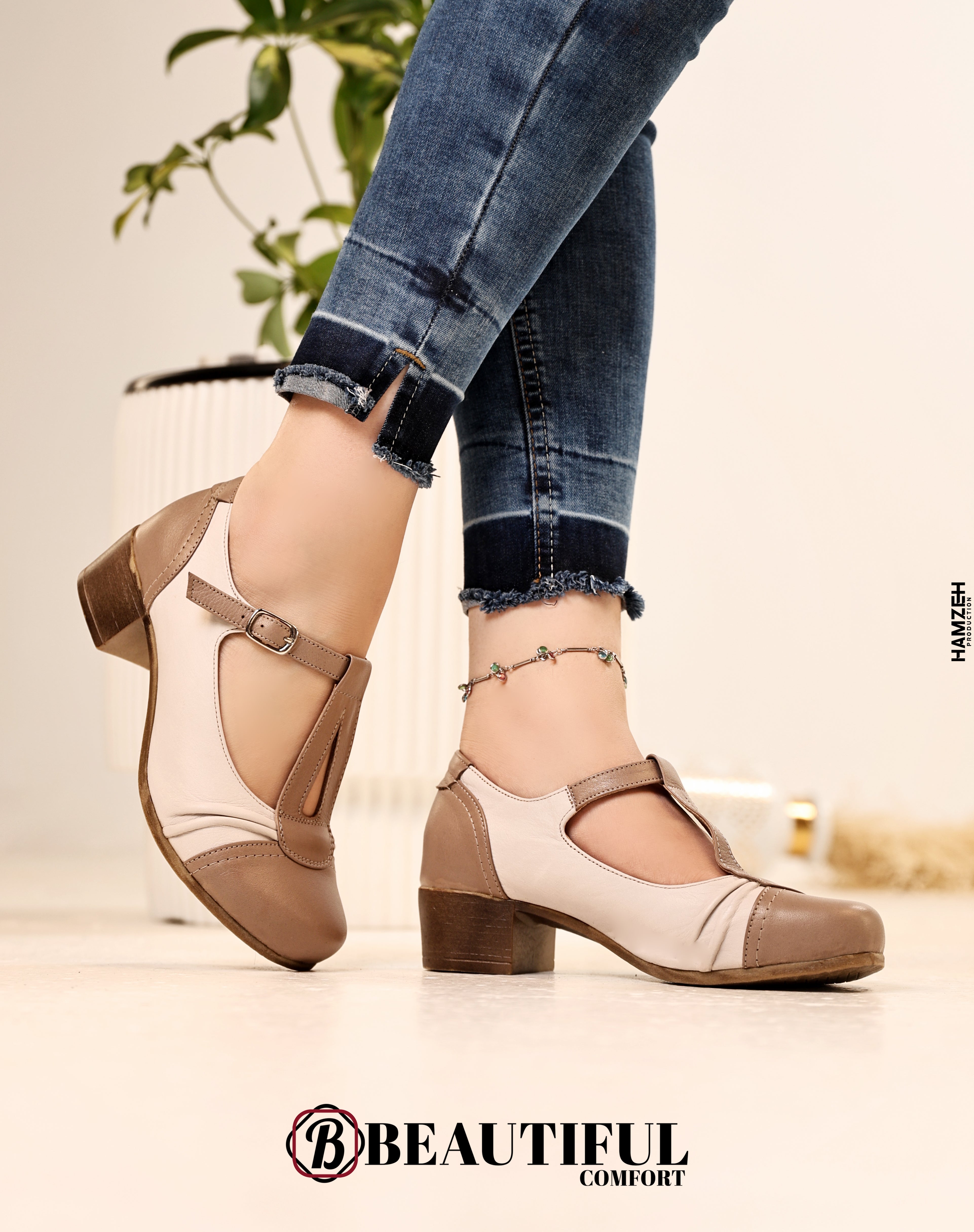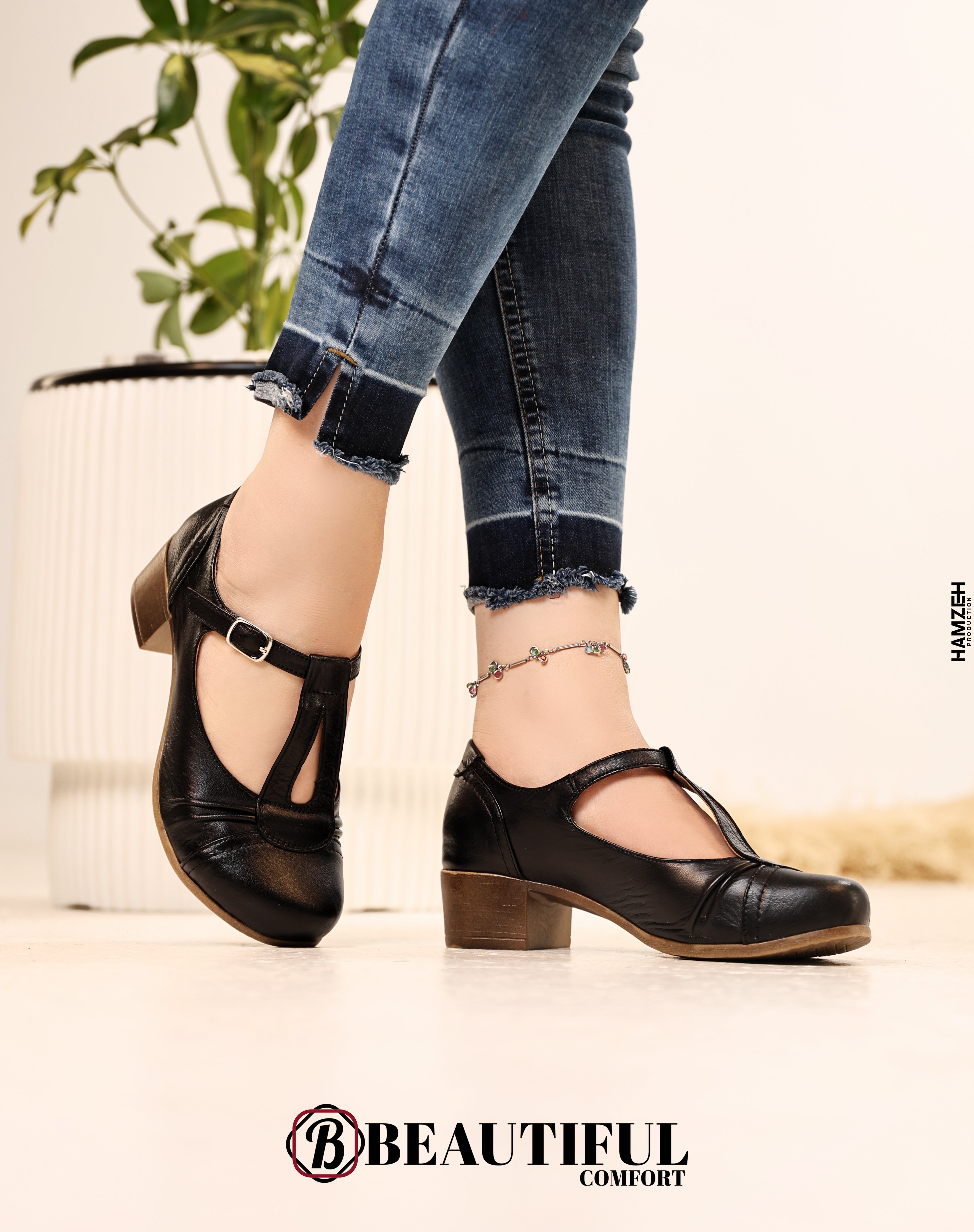 حذاء نسائي أنيق بكعب متوسط، يتميز بتصميم مغلق مع فتحات جانبية وحزام للإحكام. خامة ناعمة وكعب ثابت يوفران راحة وثبات، مناسب للاستخدام اليومي والعمل